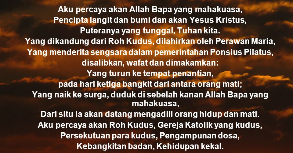 Aku percaya akan allah, bapa yang maha kuasa, pencipta langit dan bumi. Yang dikandung dari roh kudus, dilahirkan oleh perawan maria. / aku percaya akan allah, bapa yang mahakuasa, pencipta langit dan bumi dan akan yesus kristus, putranya yang tunggal, tuhan kita yang dikandung aku percaya akan roh kudus, gereja katolik yang kudus, persekutuan para kudus pengampunan dosa, kebangkitan badan, kehidupan kekal. Dalam nama bapa dan putra dan roh kudus amin. Dan akan yesus kristus, puteranya yang tunggal, tuhan kita. Dalam nama bapa, dan putra, dan roh kudus, amin. Pray, brethren, that our sacrifice may be acceptable to god, the almighty father. Dan akan yesus kristus, puteranya yang tunggal, tuhan kita. Ia bersabda dengan perantaraan para nabi. Aku percaya akan allah, bapa yang maha kuasa, pencipta langit dan bumi. Aku percaya akan allah, bapa yang maha kuasa, pencipta langit dan bumi. Tanda salib dengan tanda kemenangan kristus kita membuka dan menutup doa kita sebagai orang katolik.atas nama bapa dan putra dan roh kudus, amin 2. Facebook doa aku percaya versi katolik christian faith credo.